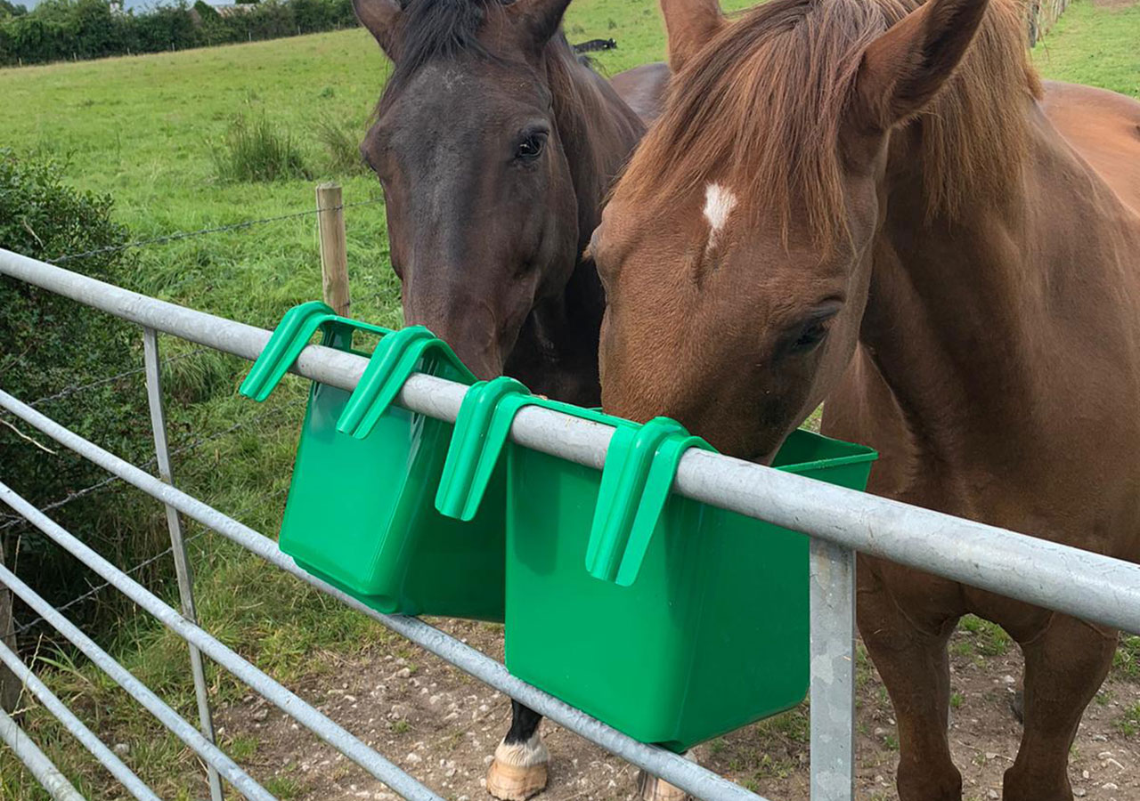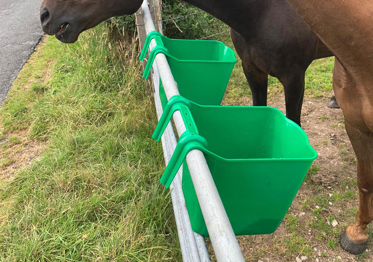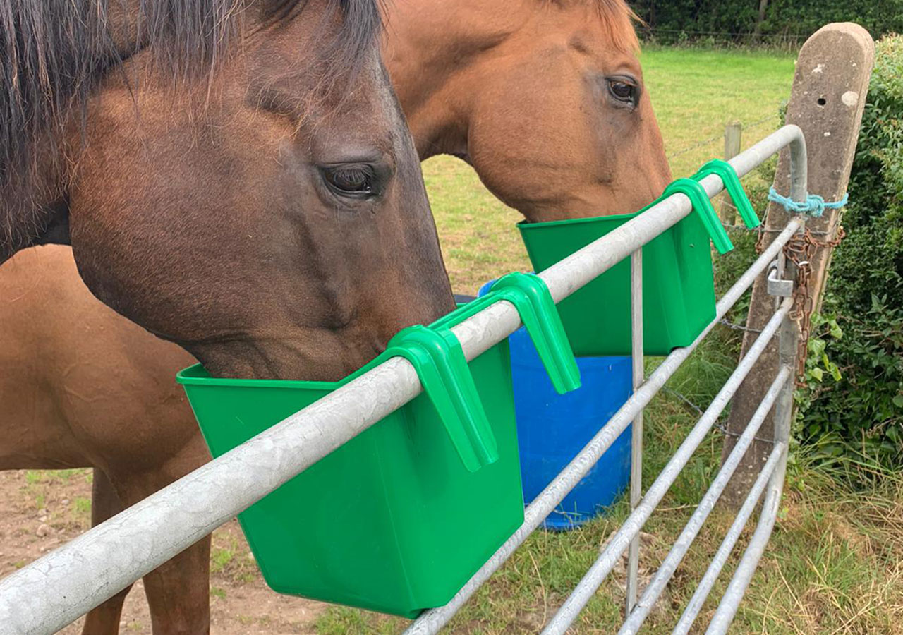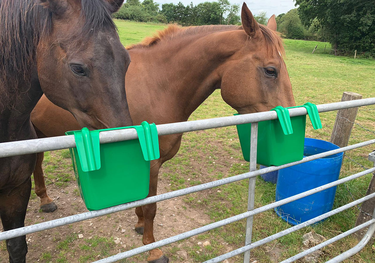 Hook over feed bucket made with strong green polypropylene. This material is best known for being resistant to damage; including impact and freezing. It is also resistant to fatigue and corrosion. Fits most gates. Finished with no sharp edges or corners to protect your animals.